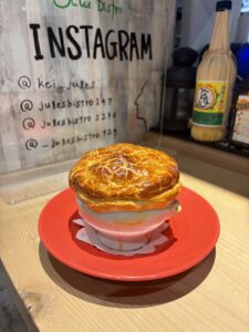 今回はヒラメ、黒鯛、アンコウからスープを取り、次にムール貝、蛤からスープを取り、更に2つのスープを合わせ馴染ませながら野菜の旨味を出したクラシックなフランスの魚介スープに牡蠣を加えた贅沢なパイ包みスープとなっております(^.^)