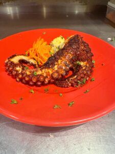 1.3-1.5kgサイズのタコを香草や柑橘系フルーツで2時間程じっくり下茹でし、オーダーが入ったらエルドプロバンスと自家製スパイシーオイルを使用して、鉄板で表面をカリカリに焼き上げてご提供します!